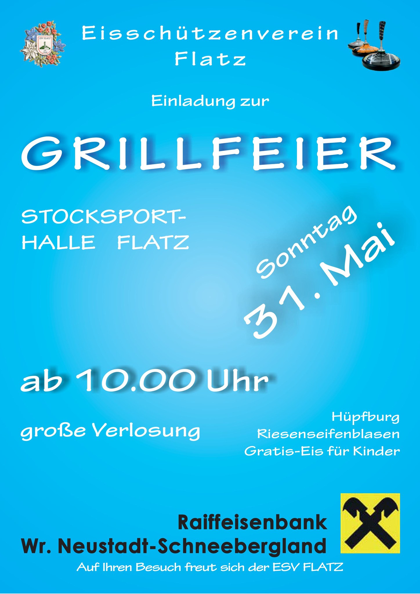 Am Sonntag, den 31. Mai 2026 findet die Grillfeier ab 10 Uhr in der Stocksporthalle in Flatz statt.